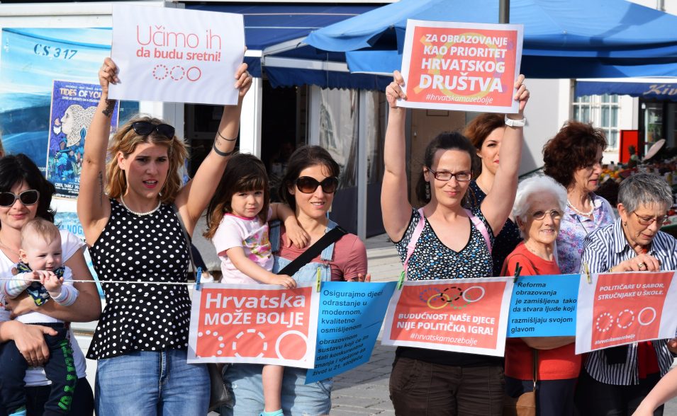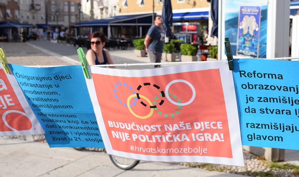 Na Trgu Frane Petrića skupina prosvjednika (točnije - uglavnom prosvjednica), njih tridesetak, postavila je poruke podrške reformi školskog programa koju je pripremila radna skupina na čelu s Borisom Jokićem - "Obrazovanje kao prioritet hrvatskog društva", "Ni lijevo, ni desno, nego obrazovanje", "Budućnost naše djece nije politička igra" i slične.